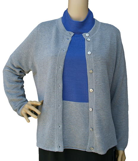 ライトグレー色横ボーダー編みカーディガン(絹100%)